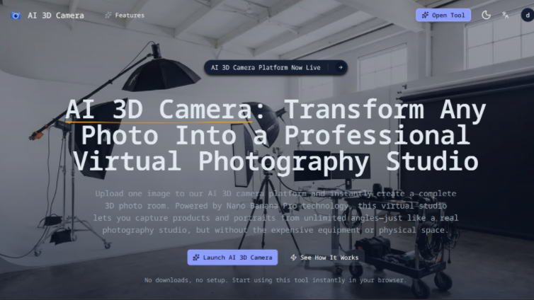 AI 3D Camera is a virtual photography studio that lets you upload one image and instantly create a complete 3D photo room, giving you the power to capture products and portraits from unlimited angles without expensive equipment or physical studio space. Powered by Nano Banana Pro technology and Google’s advanced 3D imaging engine built on Gemini 3 Pro, this AI 3D camera platform runs entirely in your browser with no downloads or setup required.