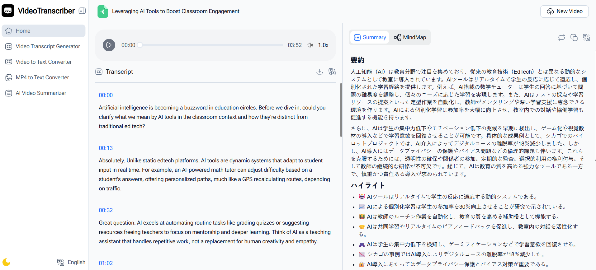 If you often watch long YouTube videos, webinars, or online lectures and wish you could just get the key points fast, then you’ll love what VideoTranscriber.ai can do.