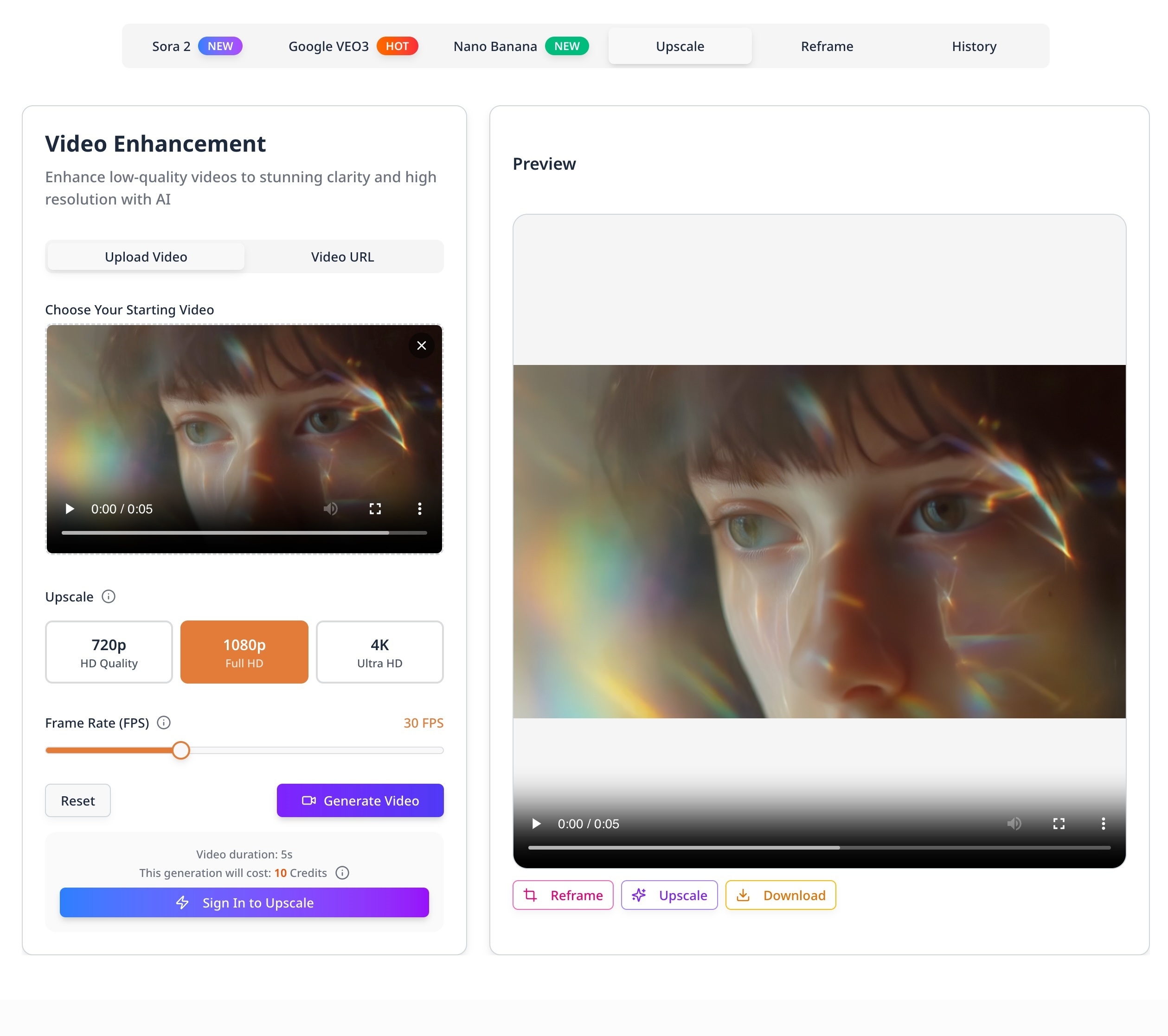 The Upscale feature lets you improve the quality of your videos by enhancing the resolution. Whether your original video is in low resolution or needs fine-tuning for higher-quality playback, Upscale can increase it to HD or 4K quality, ensuring your content always looks its best.