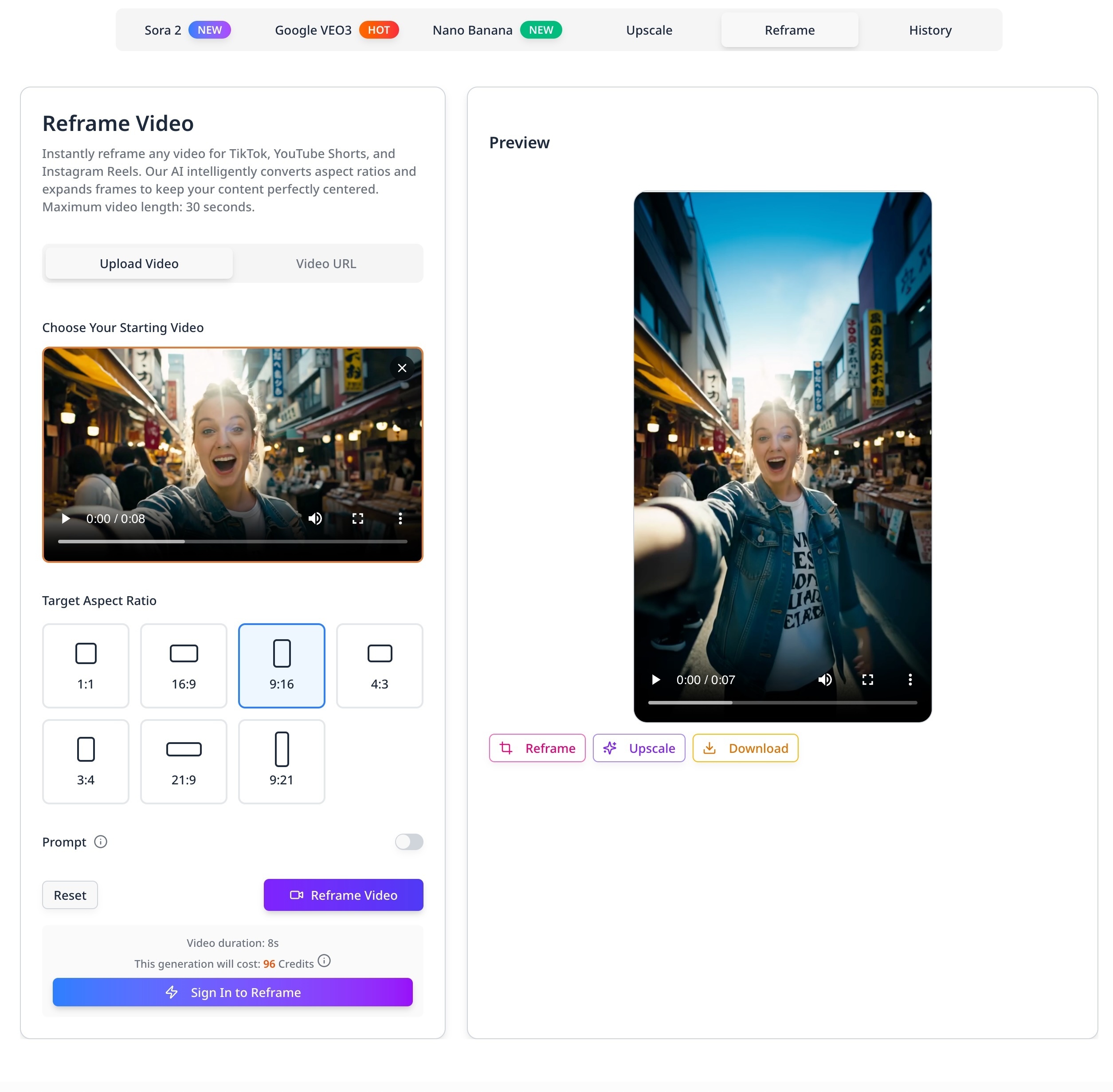 With Reframe, you can automatically adjust videos to fit different aspect ratios, such as 9:16, 16:9, or 1:1. This feature is a game-changer for social media creators, ensuring that your videos are ready to be shared without additional cropping or resizing. It’s perfect for platforms like Instagram, TikTok, and YouTube Shorts.