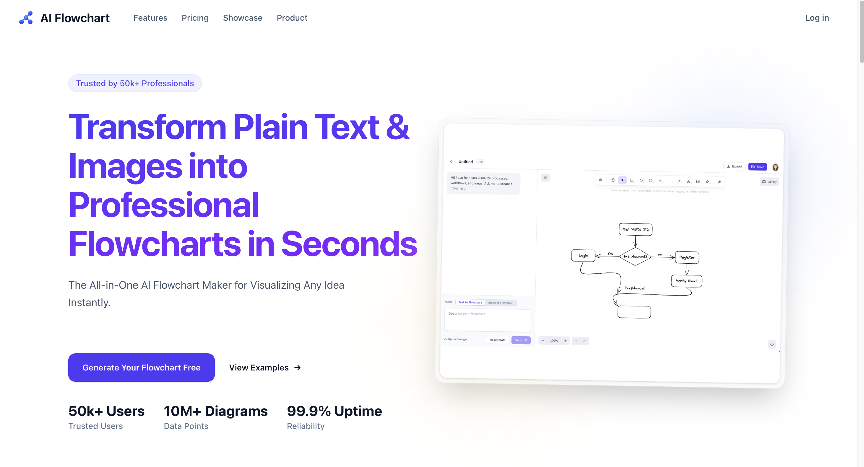 AI FlowChart(https://aiflowchart.net) is an AI flowchart generator that turns text prompts and images into clean, editable flowcharts in seconds. Built for product teams, developers, analysts, and operators, it helps you document workflows, map decision trees, and visualize complex processes without manual diagram work. You can generate from plain language, convert whiteboard photos, refine layouts in the built-in editor, and export to SVG, PNG, or Excalidraw format. Whether you are designing onboarding flows, business processes, system logic, or SOPs, AI FlowChart helps teams move from idea to clear visual execution faster.