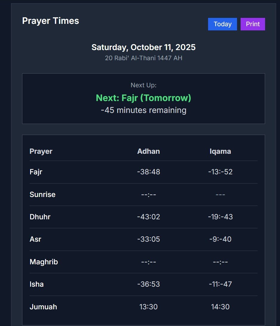 I have been using this tool daily, and it has become part of my routine. The reliability and accuracy have helped me stay punctual, and I no longer worry about miscalculating prayer times. The combination of ease-of-use, precise timing, and practical layout makes it a standout resource for anyone looking to keep their spiritual schedule on track.