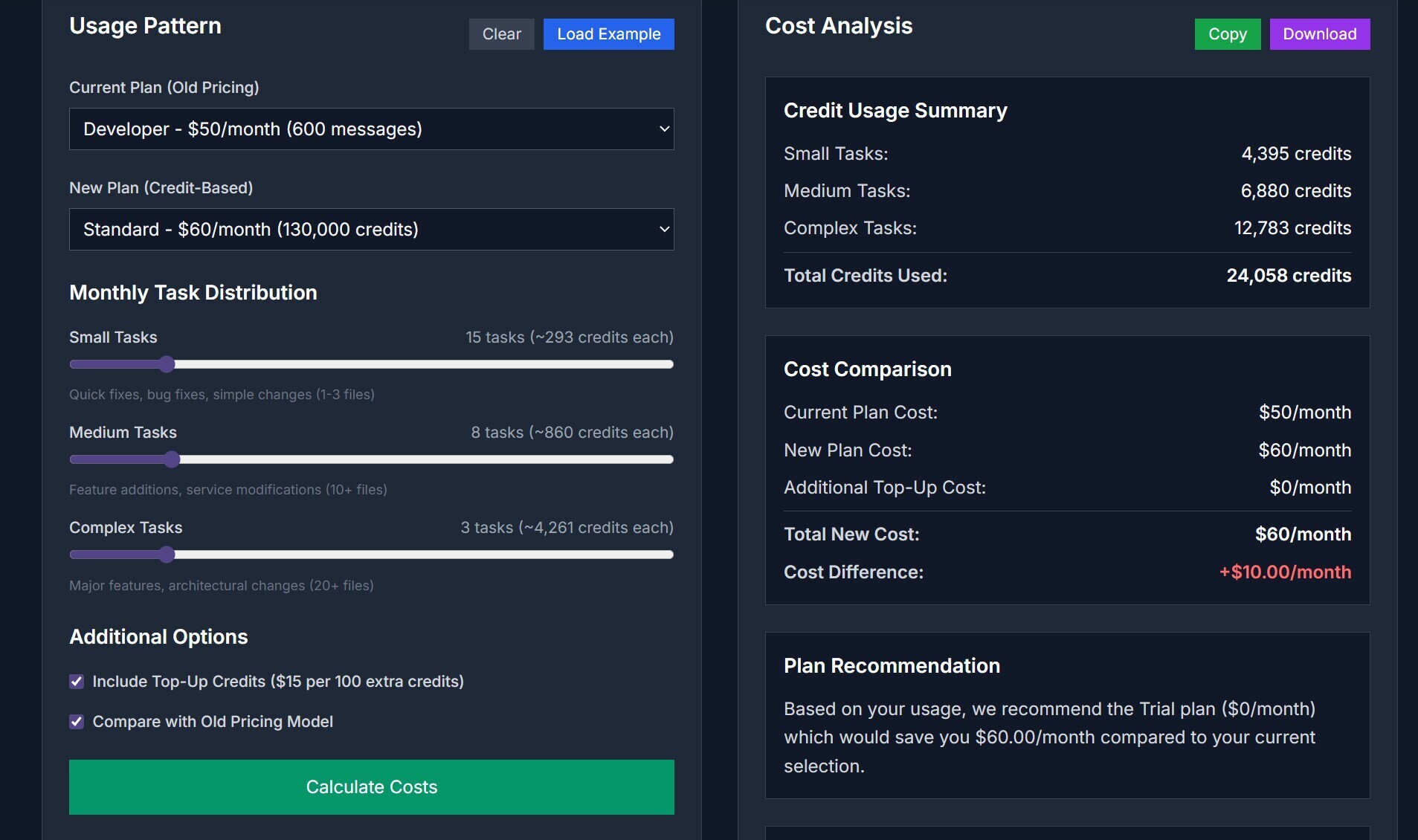 Ease of use is another strength of the Augment Code Cost Calculator. The interface is clean and intuitive, ensuring that anyone—from seasoned engineers to non-technical managers—can input data quickly. Results are displayed in a structured format that highlights both totals and breakdowns, making them easy to interpret.