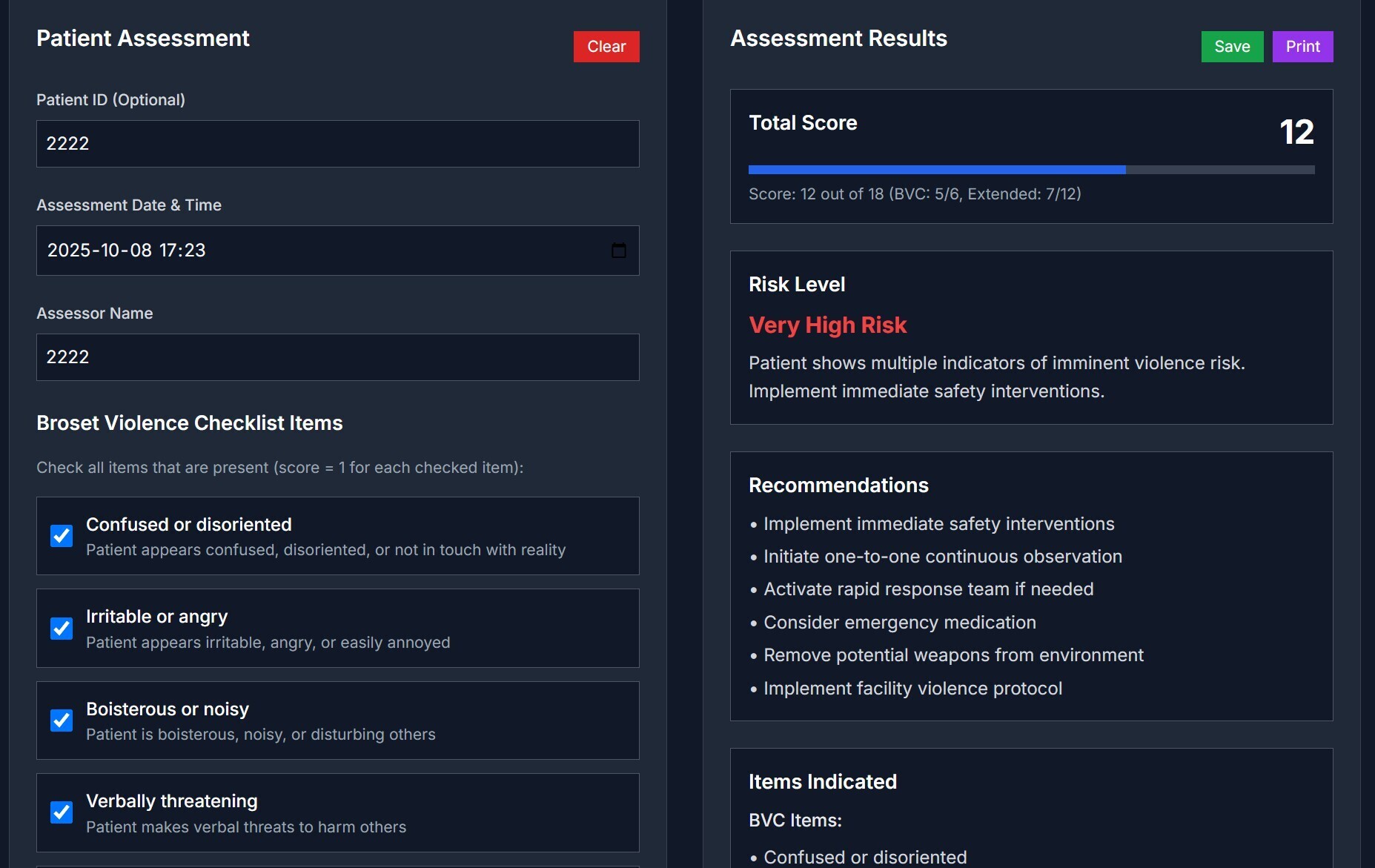 The Broset Violence Checklist is grounded in evidence-based practice, offering an objective assessment method that improves patient safety and staff protection. Its widespread use in psychiatric inpatient units, emergency departments, forensic settings, and crisis intervention teams underscores its reliability and effectiveness.