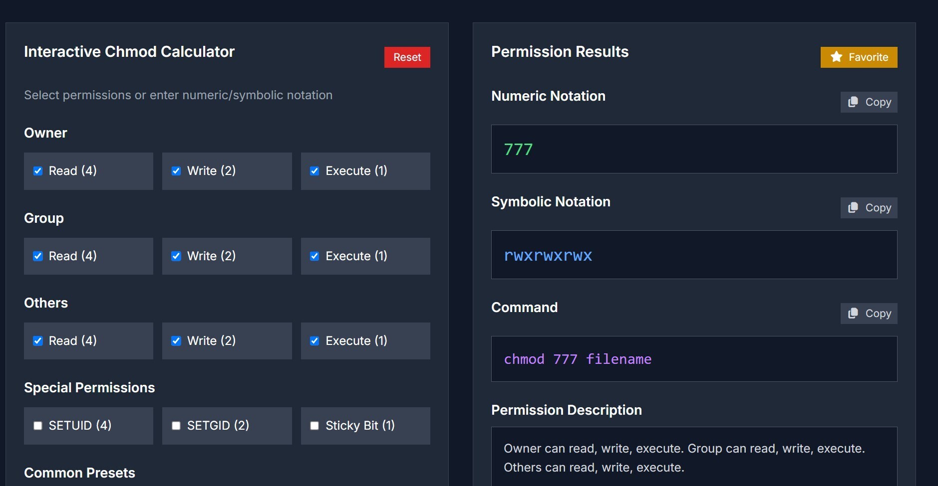 Overall, the Chmod Calculator is a powerful and easy-to-use tool for anyone managing Linux file permissions. Its real-time updates, dual display, and clear explanations make it a must-have utility for developers and system administrators.