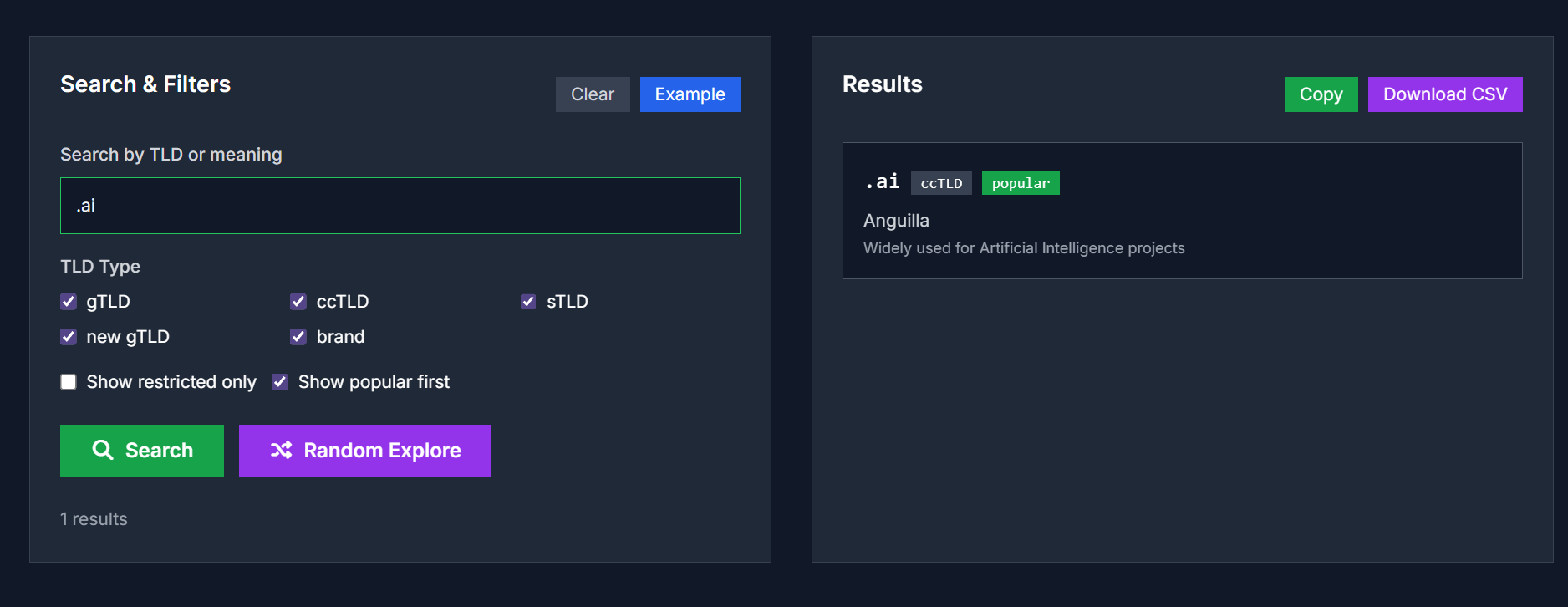 Search by Extension or Meaning: Users can search using the TLD itself (e.g.,