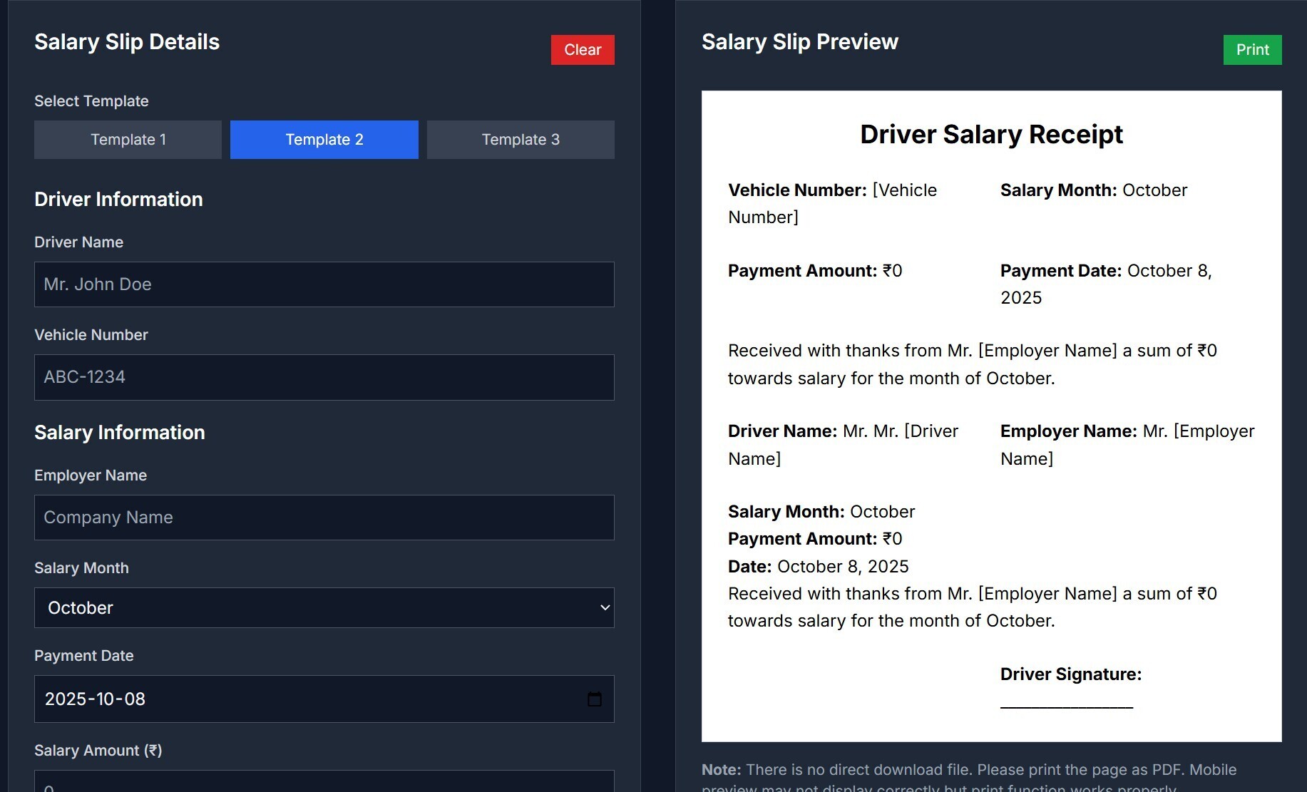 After filling in the necessary details, I clicked the "Generate Salary Slip" button. The tool promptly displayed a preview of the salary slip, allowing me to review the information for accuracy. Once satisfied, I used the "Print PDF" option to save the document as a PDF file. This feature is particularly useful for record-keeping and sharing with drivers or accounting departments.