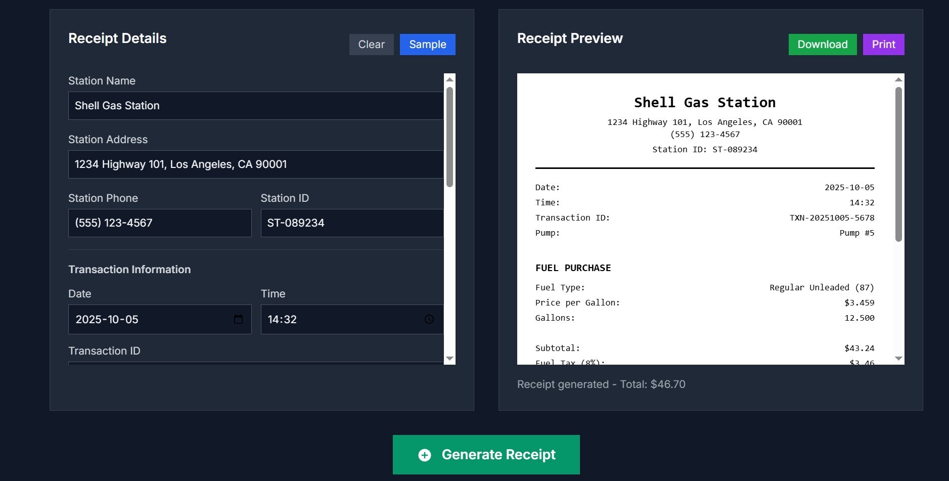 When I first used this tool, I noticed how easy it was to enter details like the station name, fuel type, and cost. The interface feels straightforward, and the output is a neat digital receipt that can be saved or shared instantly. This eliminates the common problem of faded or missing physical receipts.