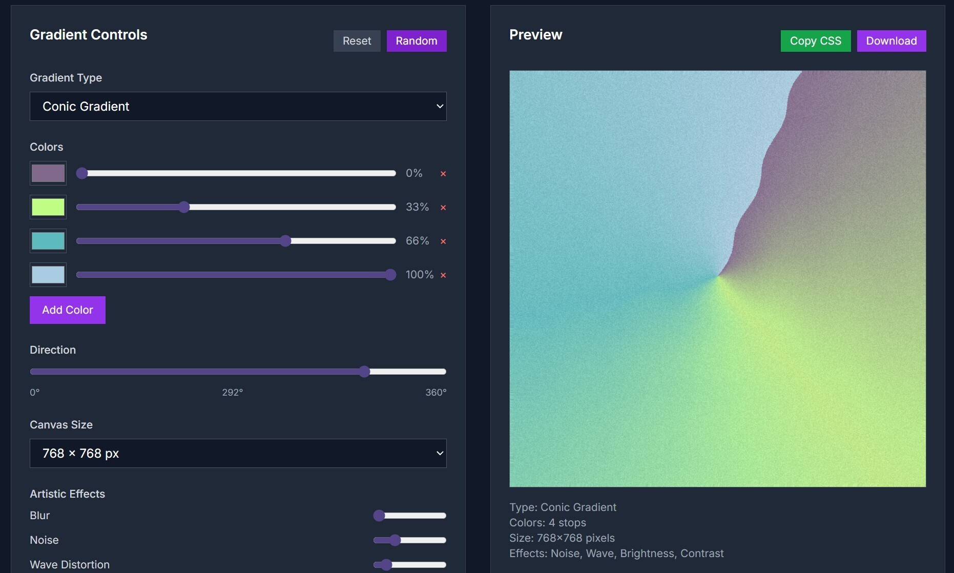 One of the standout features of this tool is its extensive range of artistic effects. Users can apply blur, noise, wave distortion, brightness, and contrast adjustments to enhance the visual appeal of their gradients. Additionally, the inclusion of blend modes such as Normal, Multiply, Screen, Overlay, and others provides further flexibility in achieving the desired aesthetic.
