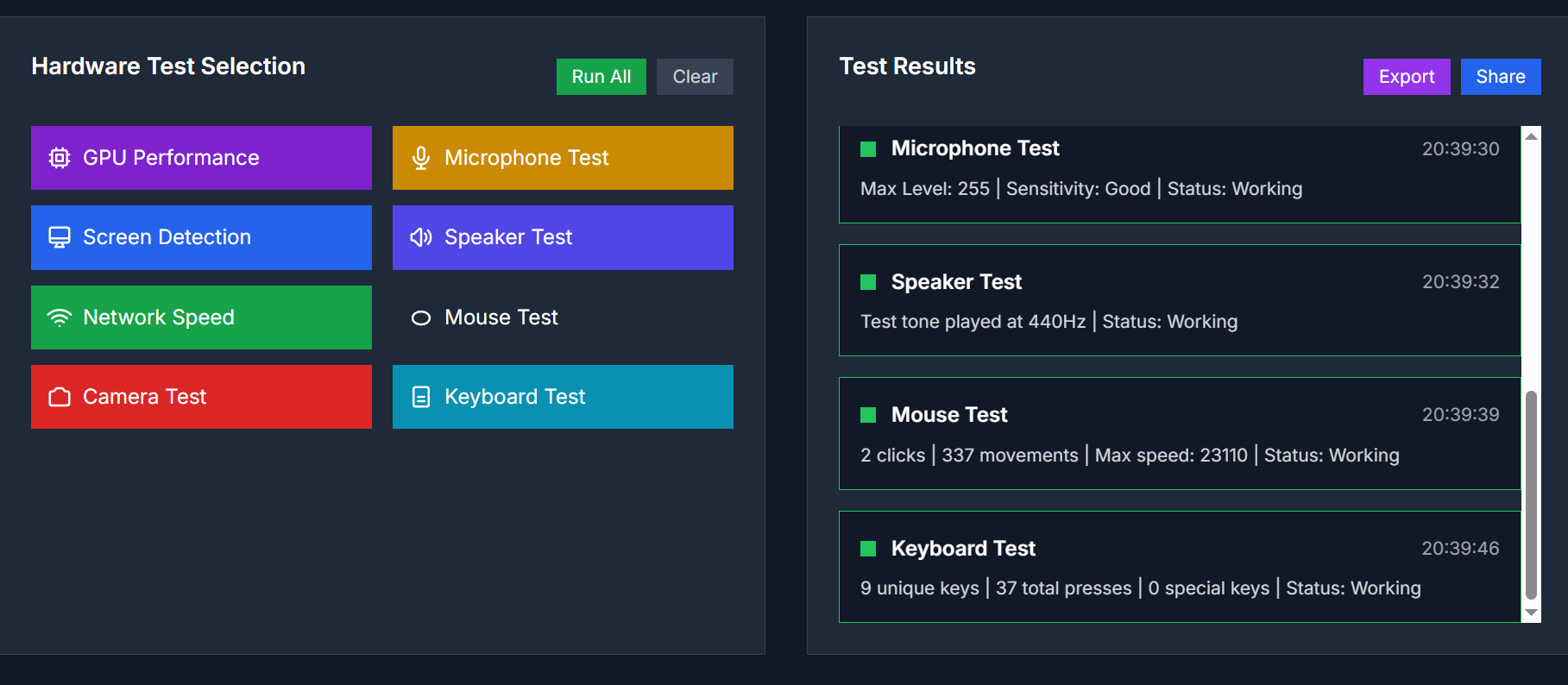 - Keyboard Test: Detects key presses and keyboard layout.