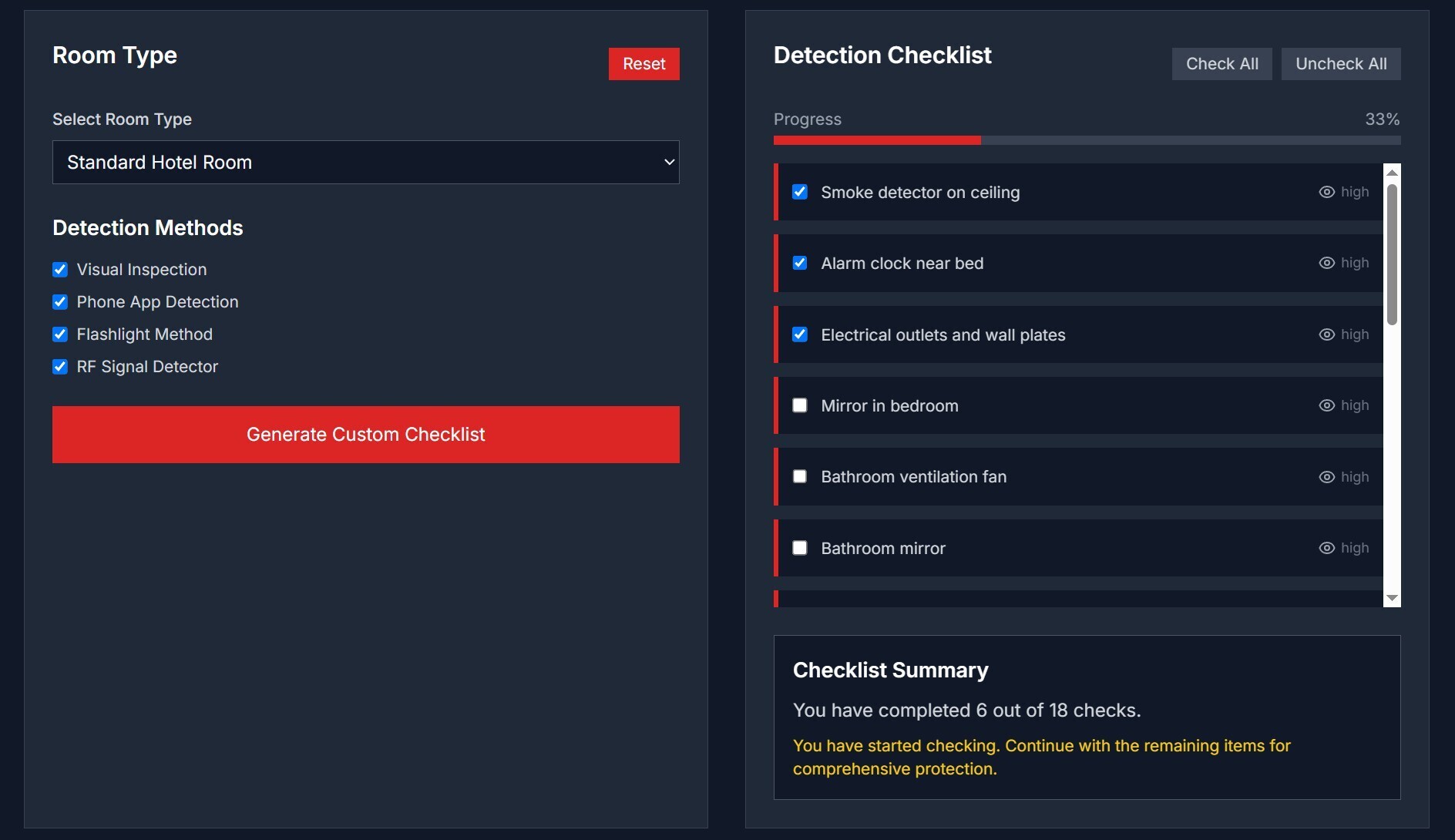 One feature I especially appreciate is the custom checklist generator. After selecting the room type and detection methods you prefer, the tool produces a tailored checklist of steps to follow. That checklist covers things like inspecting unusual holes, checking electronic devices, verifying smoke detectors, and scanning mirror surfaces. As someone who travels often, having that checklist means I don’t forget little but important things. It feels like a personal privacy guide.