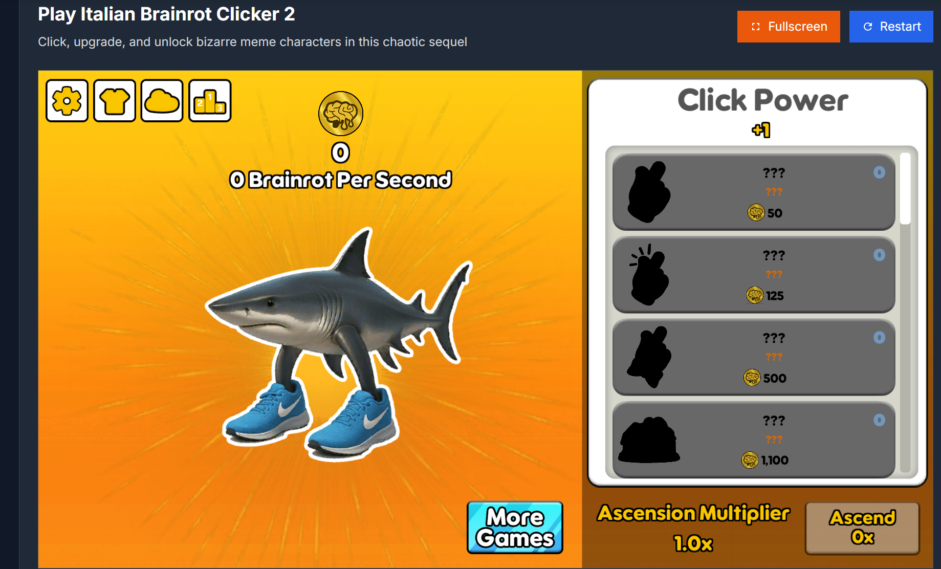 If you want to dive into something weird, fun, and endlessly clicky, give Italian Brainrot Clicker 2 a try. See how many absurd characters you can unlock while your Brainrot empire grows.