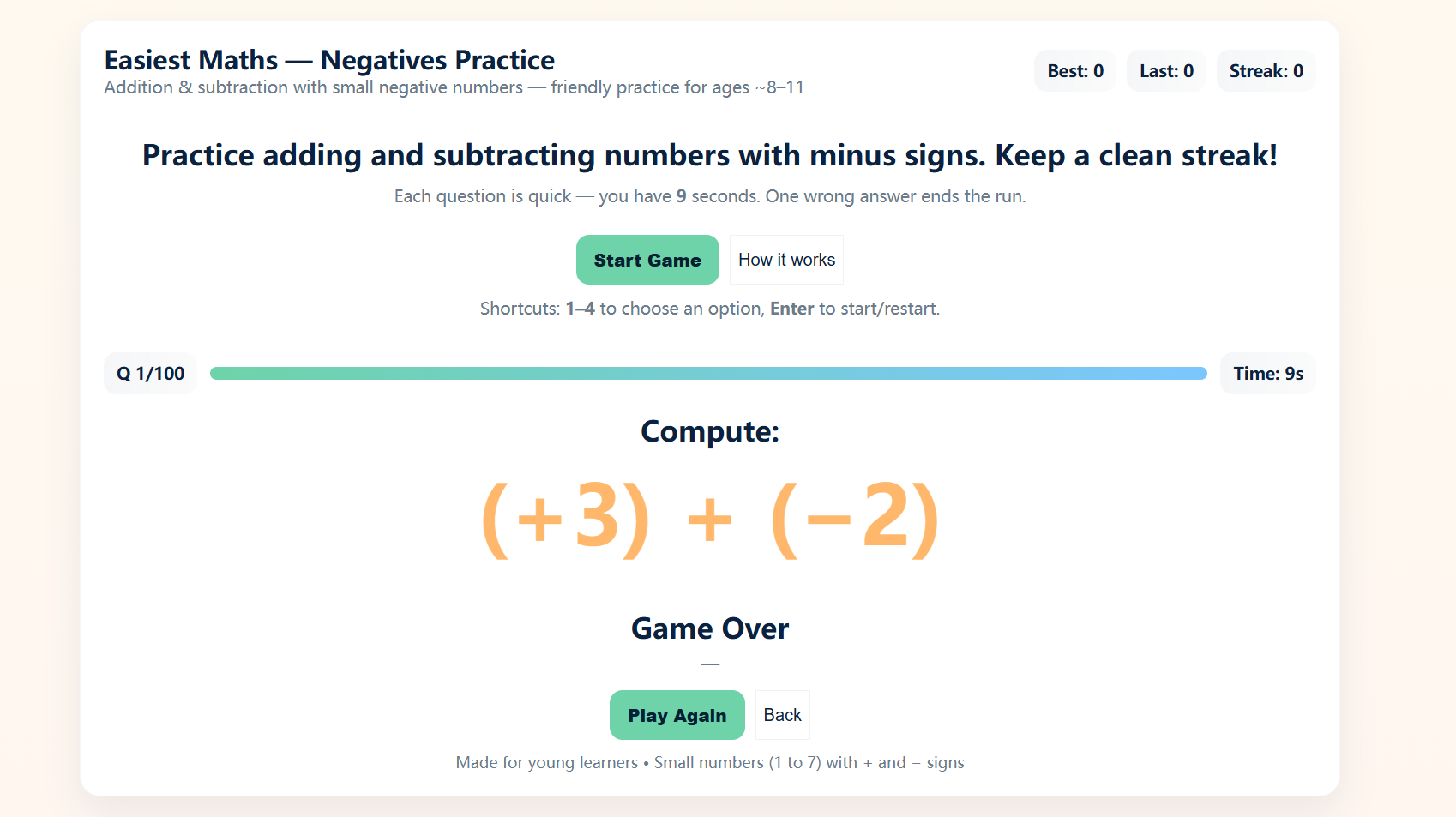I tried the Maths Quiz with Negative Numbers on prompt2tool (https://prompt2tool.com/tools/games/maths-quiz-with-negative-numbers