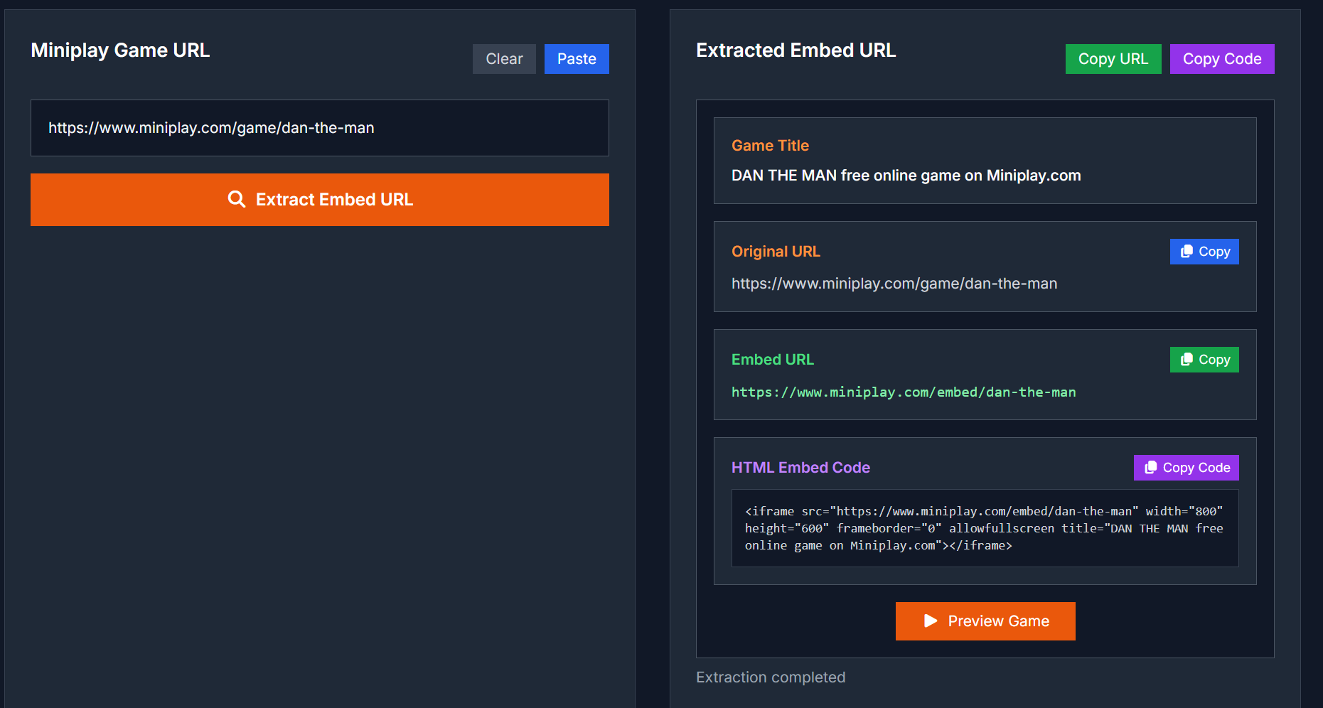 The tool detects the game identifier from the URL and transforms it into Miniplay’s official embed format.