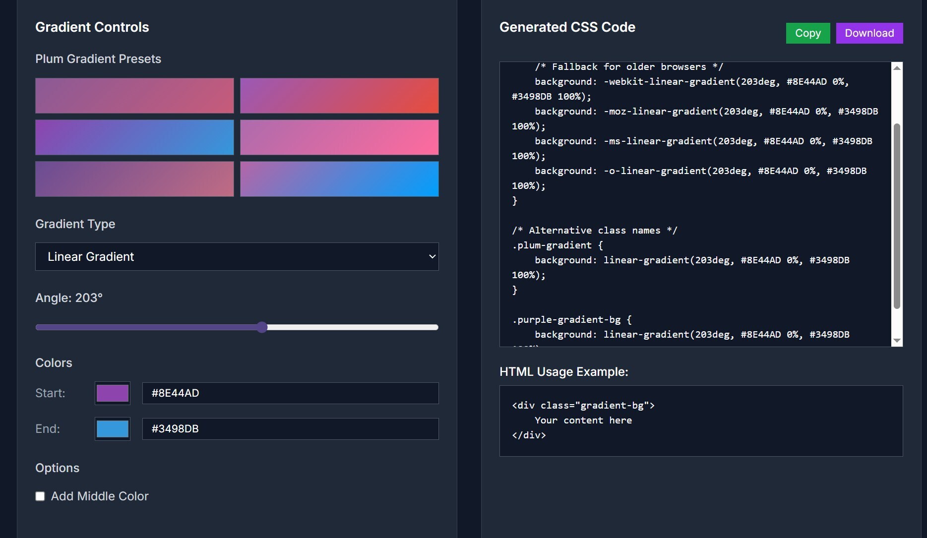 The Plum Gradient Generator also supports customization options, allowing you to fine-tune the gradient to your liking. Whether you're looking for a subtle blend or a bold contrast, the tool provides the flexibility to achieve your vision. Additionally, the generated CSS code is compatible with modern web standards, ensuring your gradients render beautifully across various browsers.