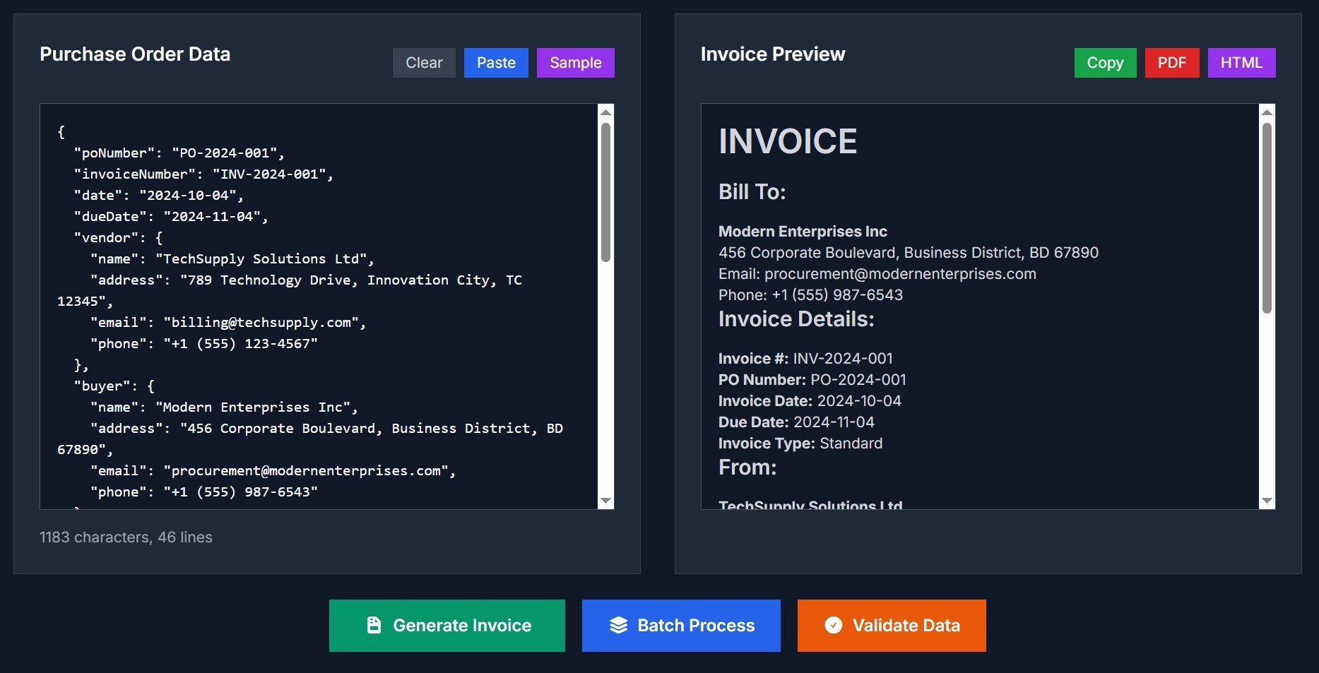 The PO Invoice Generator is a powerful online tool designed to streamline the creation of professional purchase order invoices. Ideal for procurement teams, small businesses, and accounting departments, this tool allows users to generate invoices quickly and accurately. By inputting purchase order details in JSON or CSV format, users can automatically calculate totals, apply tax rates, and customize invoice templates to meet their specific needs.