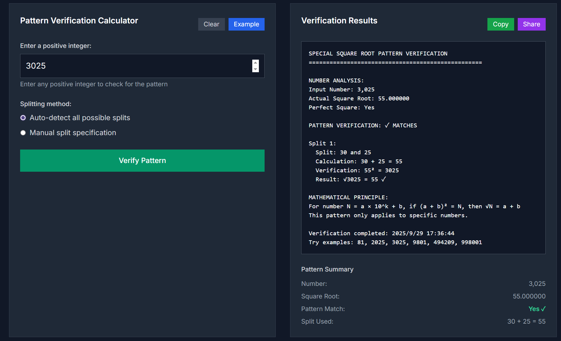 This tool highlights a unique mathematical property where certain numbers can be split into two parts, and the sum of those parts equals the square root of the number itself. It offers both learning and entertainment for anyone fascinated by number patterns.