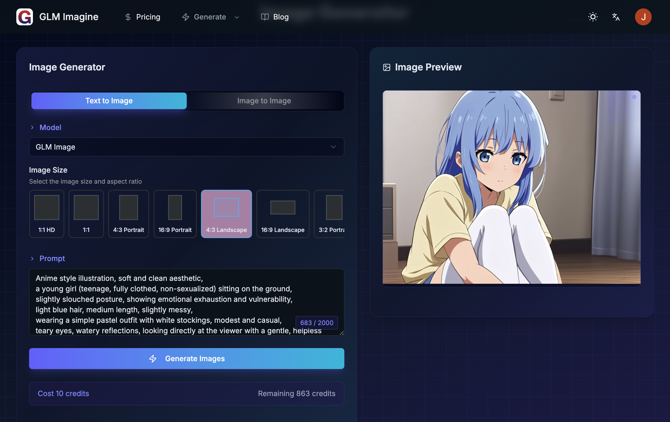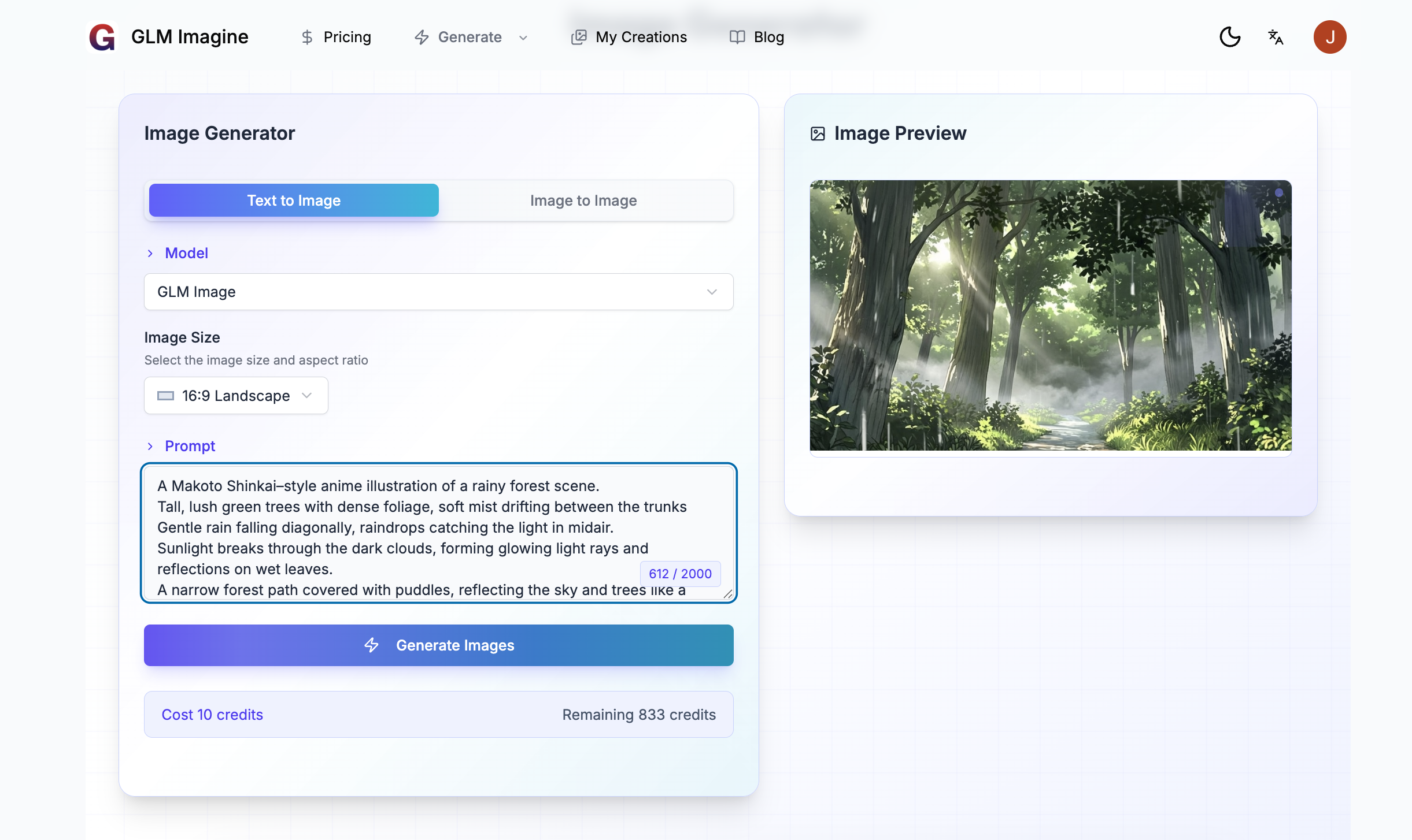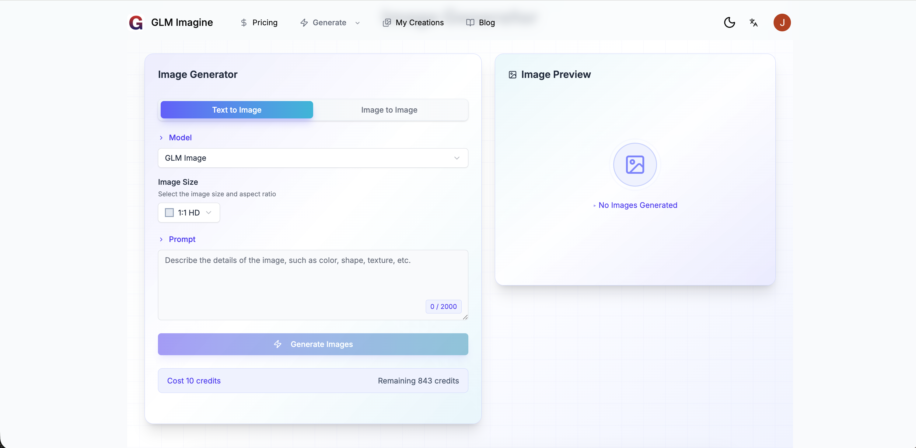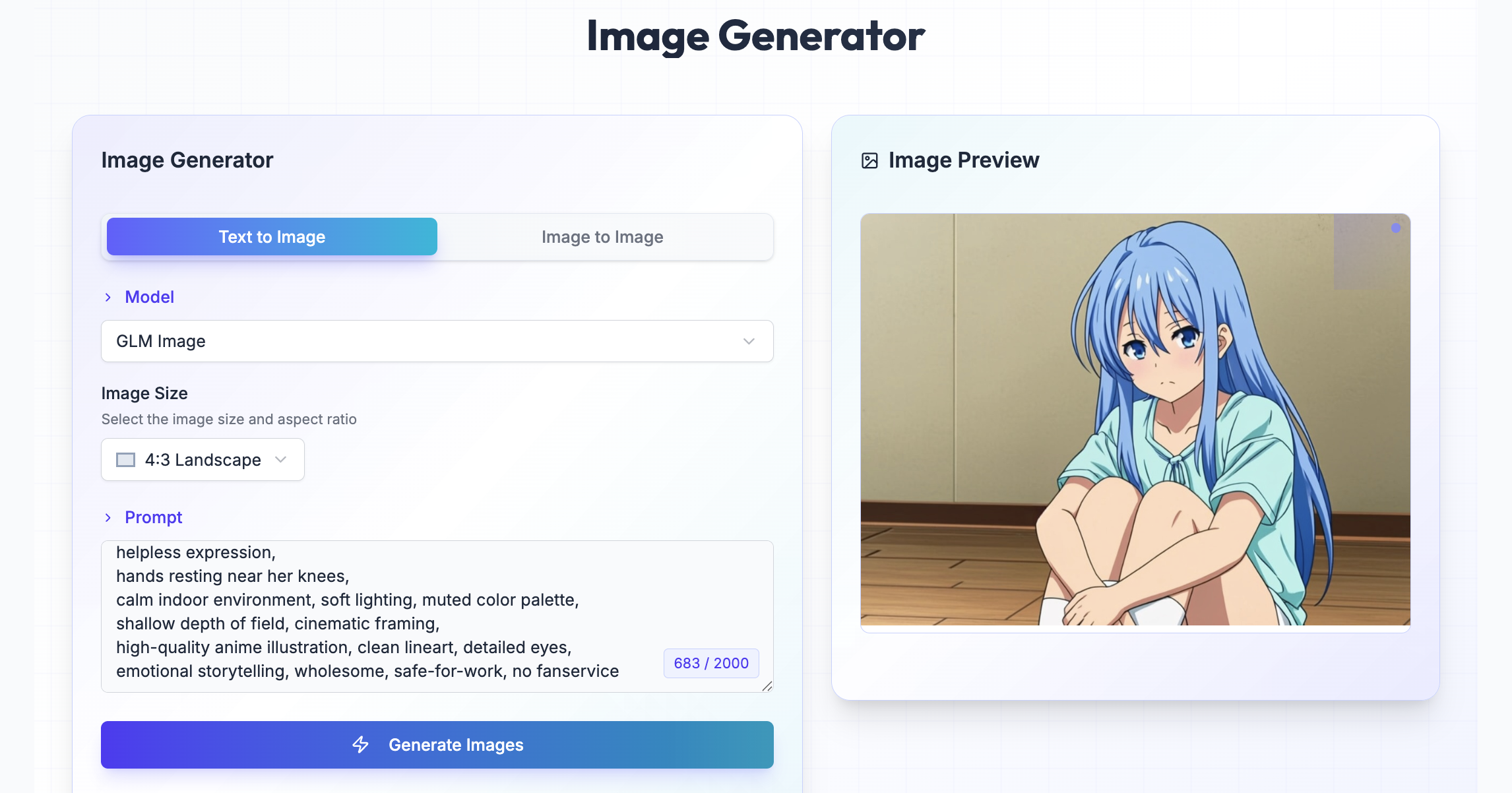 Runs on GLM-Image model. Built the frontend with Next.js. Supports both light and dark modes.