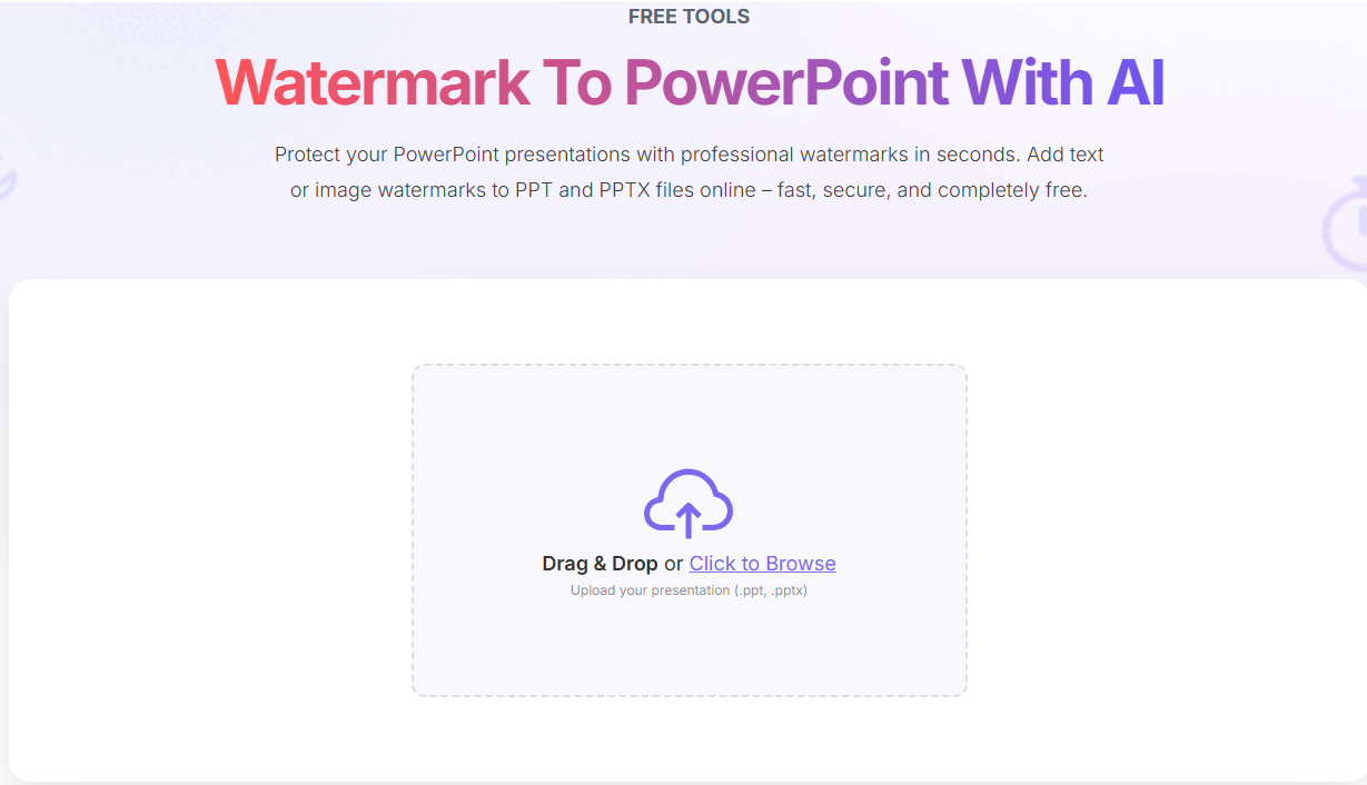 Protect your PowerPoint presentations with professional watermarks in seconds. Add text or image watermarks to PPT and PPTX files online – fast, secure, and completely free.